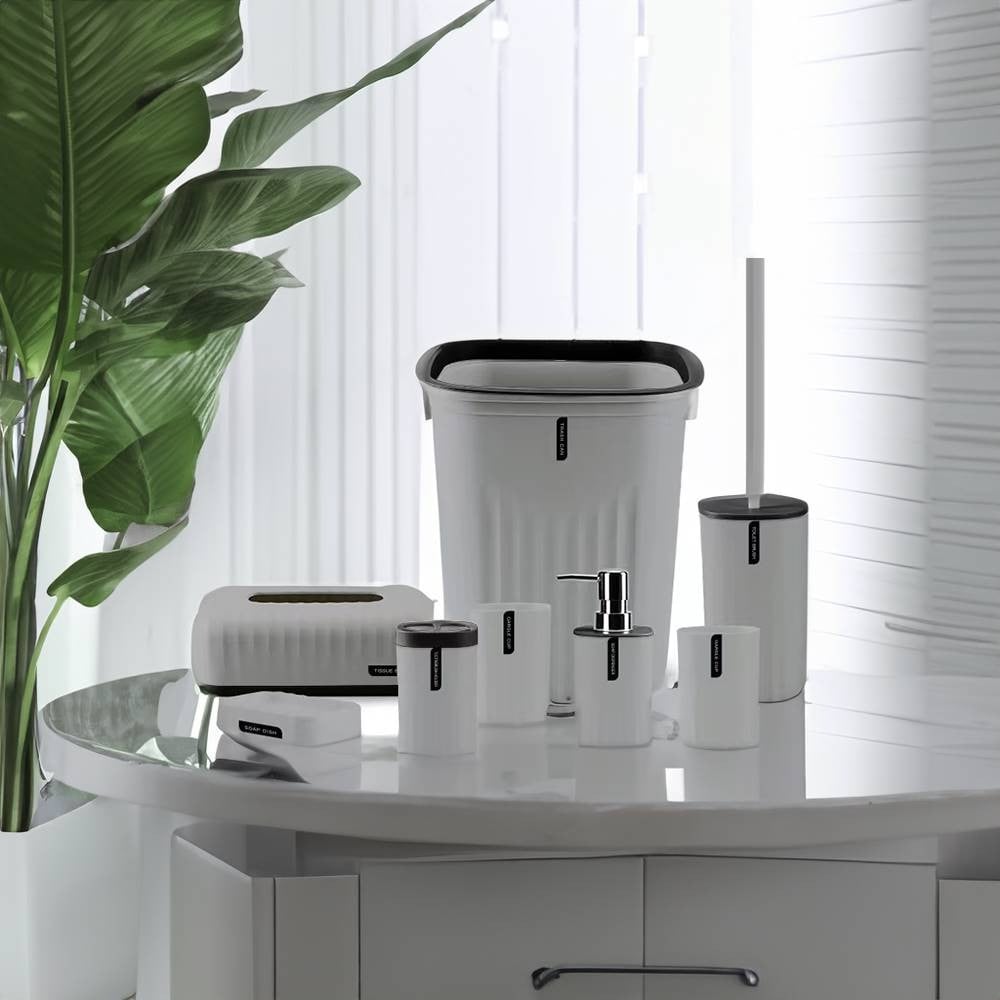 طقم اكسسوارات حمام متكامل لجميع اغراض الحمام، ثمانية قطع، مصنوعة من البولي المقاوم للكسر.
