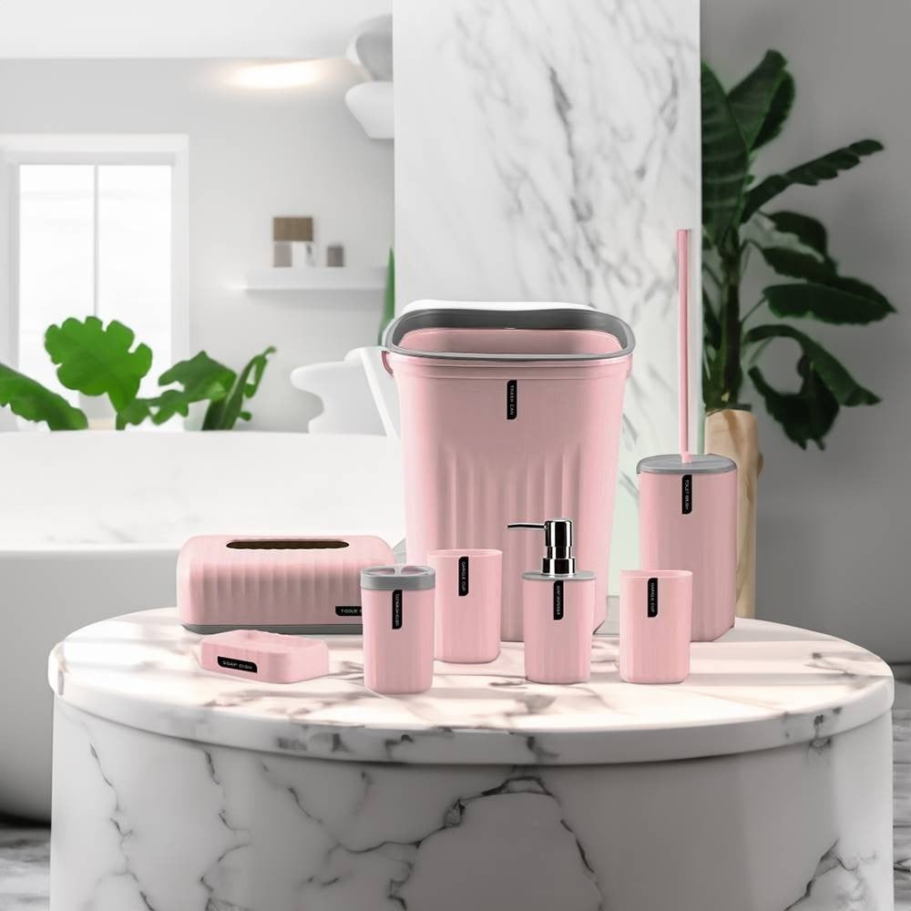 طقم اكسسوارات حمام متكامل لجميع اغراض الحمام، ثمانية قطع، مصنوعة من البولي المقاوم للكسر.اللون: زهري.تفاصيل القطع:1-وعاء صابون.2-أكواب حمام.1-حامل فرشاة أسنان.1-موزع صابون للحمام.1-فرشاة دورة مياه.1-حاوية قمامة.1-علبة مناديل.بلد الصنع : الصين.تسوق المزيد من اكسسوارات الحمام