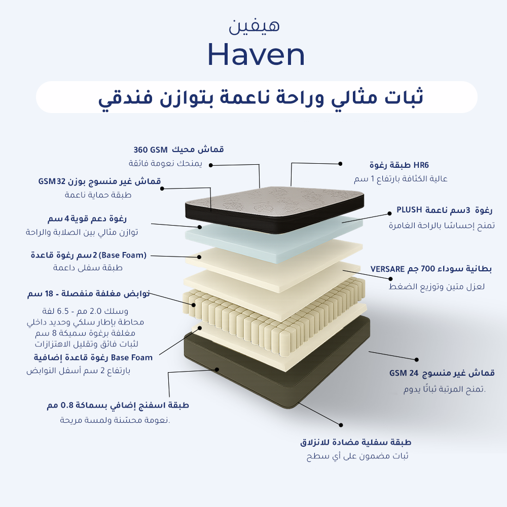 استمتع بنوم هادئ وثابت مع مرتبة هيفن Haven المصممة لتجمع بين الصلابة المدعومة والنعومة العلوية بفضل طبقة Firm P.T المدروسة بعناية. تحتوي المرتبة على طبقات متعددة مدعومة بنظام نوابض مغلفة منفصلة Pocket Springs لتحقيق دعم فعّال للجسم وتقليل انتقال الحركة، مع سطح علوي ناعم يضمن راحة فاخرة طوال الليل.