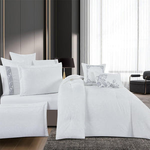 تم تصميم هذا المفرش من قماش الجاكار الفاخر بنقشة منسوجة بتصميم كلاسيكي هندسي، يجمع بين تفاصيل الروكوكو الفاخرة وتماثل زخرفي مستوحى من القصورالإيطالية تضفي طابعًا كلاسيكيًا دافئًا على غرفة نومك مع التطريز البارز اللذي يعطيك شعور الفخامة الملكية.