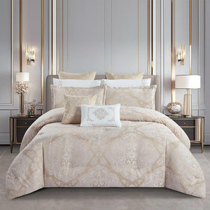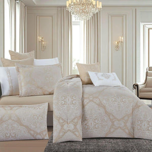 تم تصميم هذا المفرش من قماش الجاكار الفاخر بنقشة منسوجة بتصميم كلاسيكي هندسي، يجمع بين تفاصيل الروكوكو الفاخرة وتماثل زخرفي مستوحى من القصورالإيطالية تضفي طابعًا كلاسيكيًا دافئًا على غرفة نومك مع التطريز البارز اللذي يعطيك شعور الفخامة الملكية.