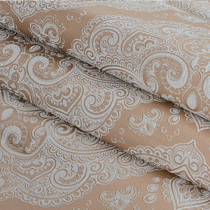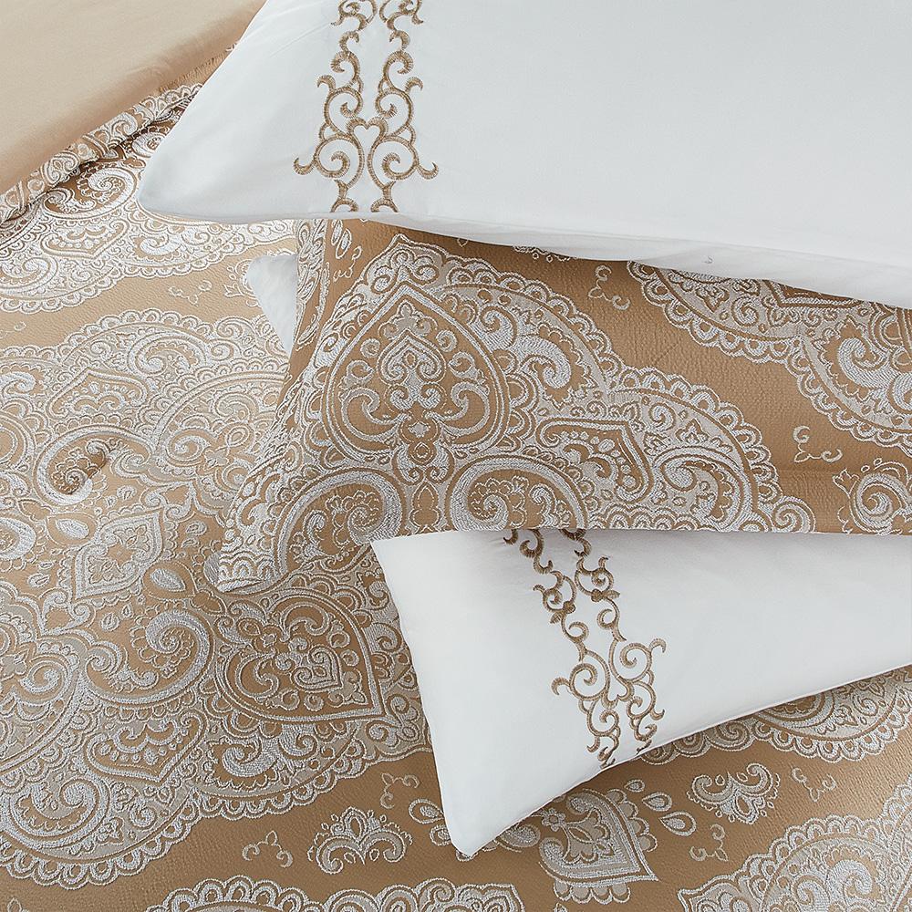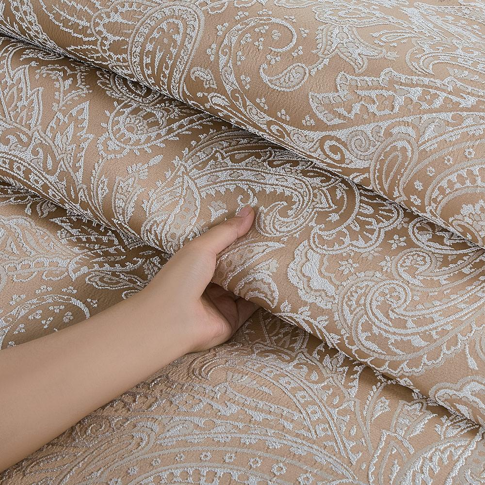 تم تصميم هذا المفرش من قماش الجاكار الفاخر بنقشة منسوجة بتصميم كلاسيكي هندسي، يجمع بين تفاصيل الروكوكو الفاخرة وتماثل زخرفي مستوحى من القصور الإيطالية تضفي طابعًا كلاسيكيًا دافئًا على غرفة نومك مع التطريز البارز اللذي يعطيك شعور الفخامة الملكية.