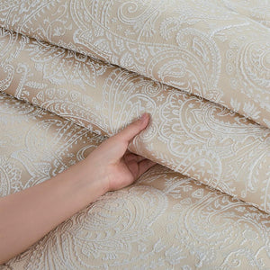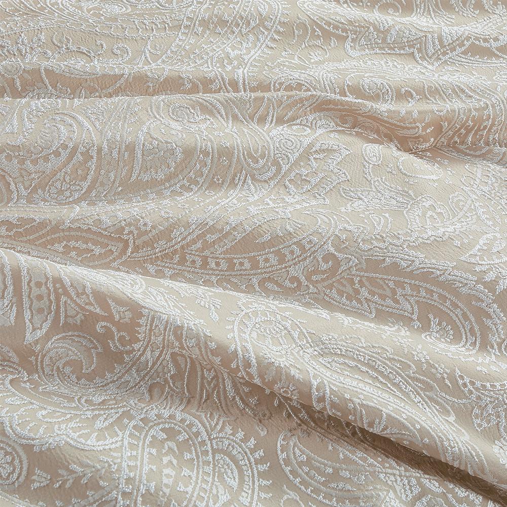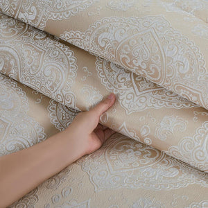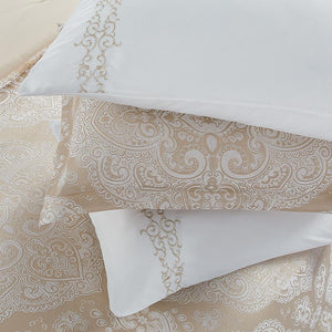 تم تصميم هذا المفرش من قماش الجاكار الفاخر بنقشة منسوجة بتصميم كلاسيكي هندسي، يجمع بين تفاصيل الروكوكو الفاخرة وتماثل زخرفي مستوحى من القصور الإيطالية تضفي طابعًا كلاسيكيًا دافئًا على غرفة نومك مع التطريز البارز اللذي يعطيك شعور الفخامة الملكية.