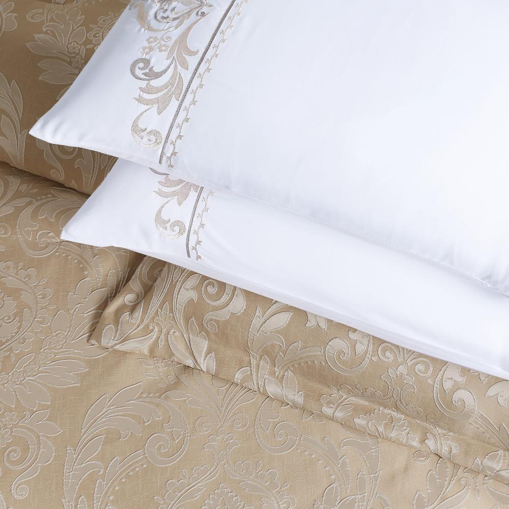 صُمم وجه المفرش من جاكار فاخر بنقشة داماسكو الملكية Royal Damask، مستوحاة من زخارف القصور الأوروبية، بتكرار كلاسيكي يضفي فخامة جريئة ومهيبة.
