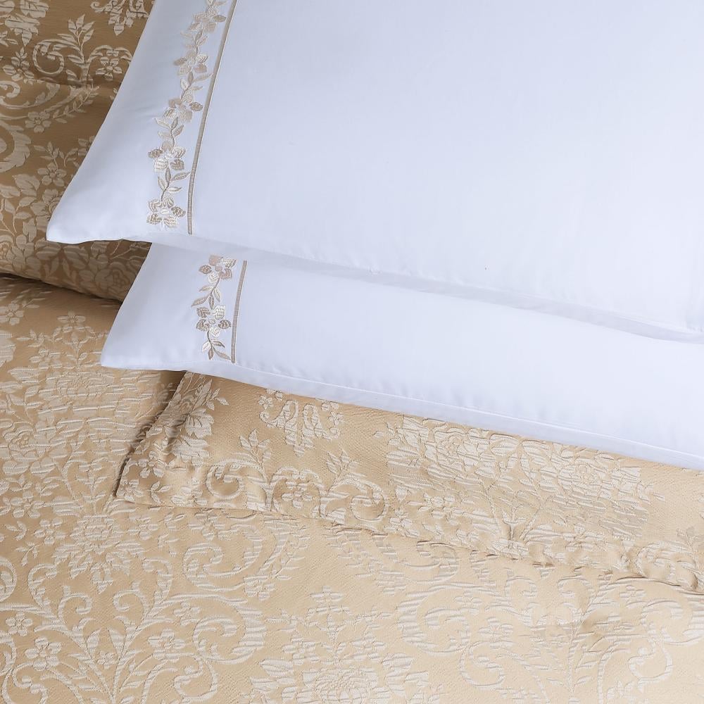 صُمم وجه المفرش من جاكار فاخر بنقشة فلورنتينا الراقية – Florentina Ornato، بنمط متماثل مستوحى من زخارف البلاط الأوروبي في قصور فلورنسا وباريس.