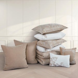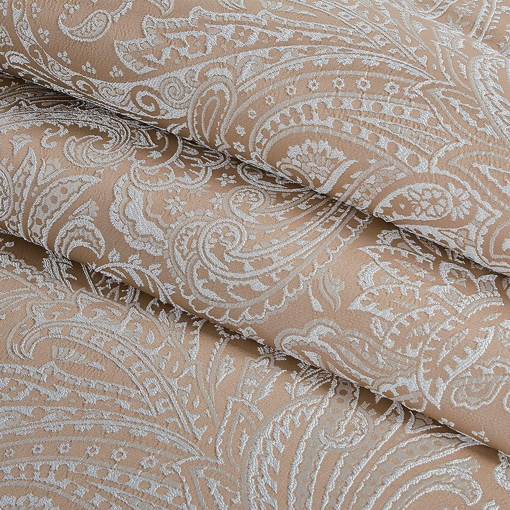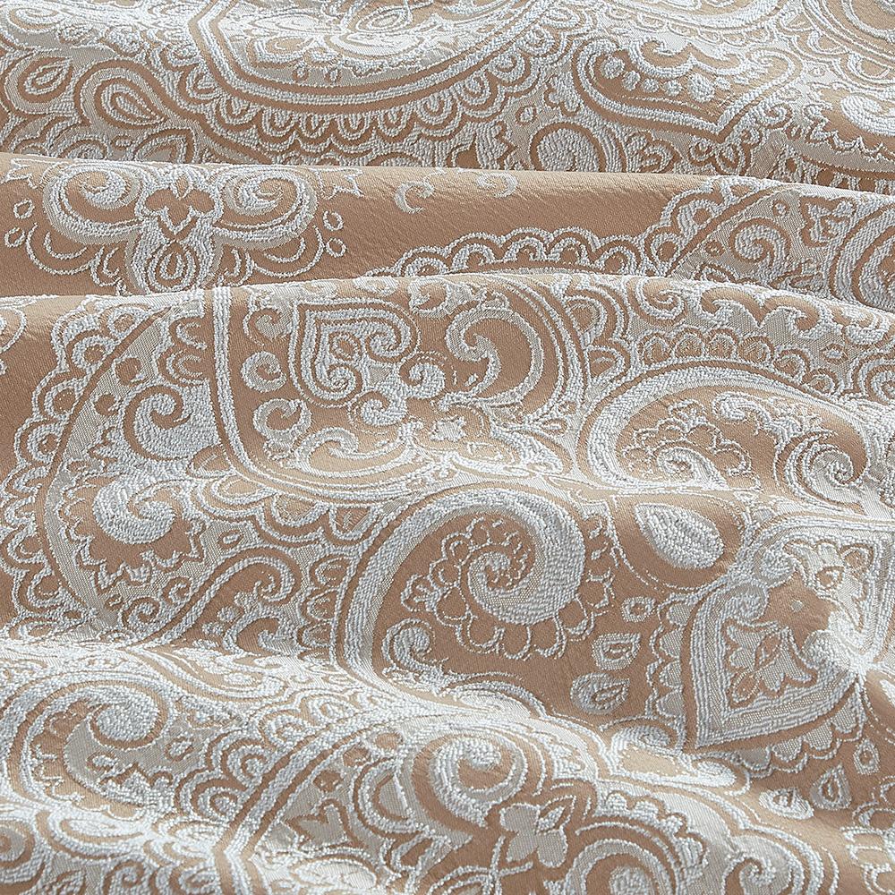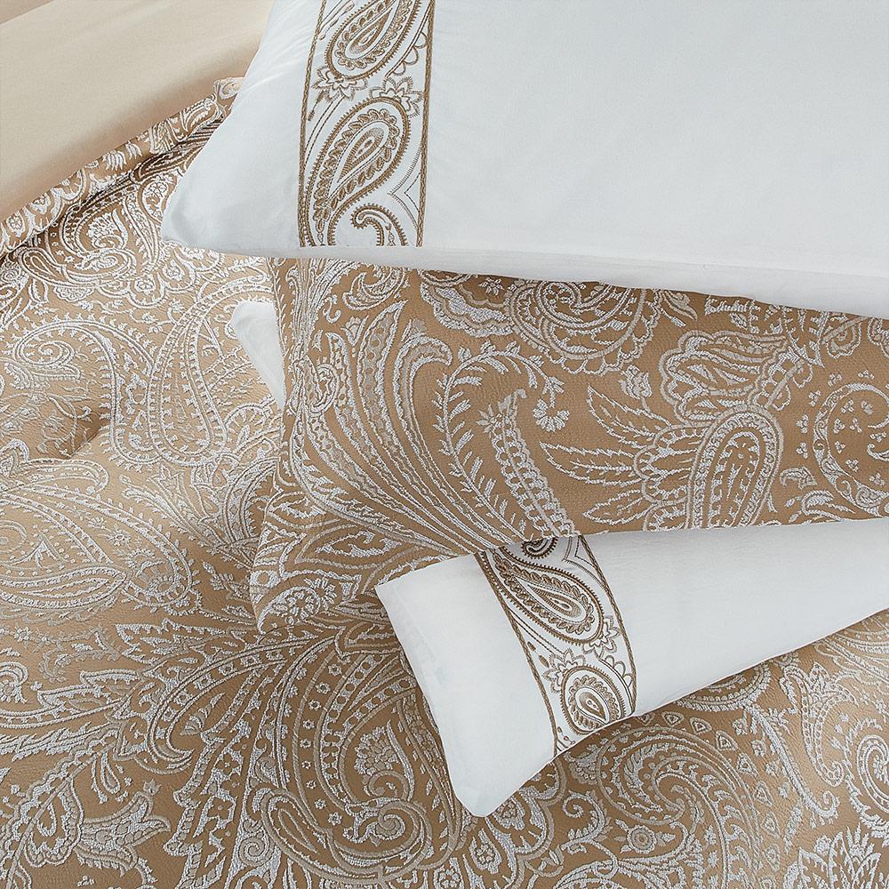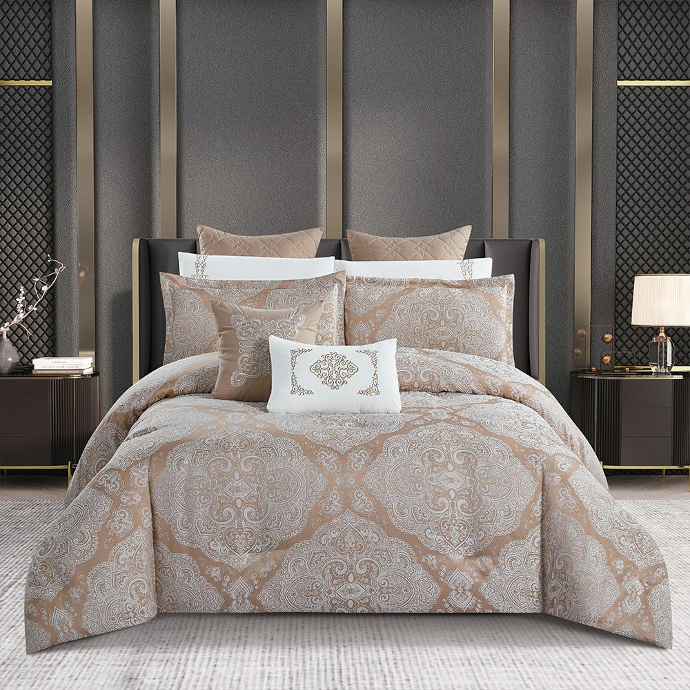 تم تصميم هذا المفرش من قماش الجاكار الفاخر بنقشة منسوجة بتصميم كلاسيكي هندسي، يجمع بين تفاصيل الروكوكو الفاخرة وتماثل زخرفي مستوحى من القصور الإيطالية تضفي طابعًا كلاسيكيًا دافئًا على غرفة نومك مع التطريز البارز اللذي يعطيك شعور الفخامة الملكية.