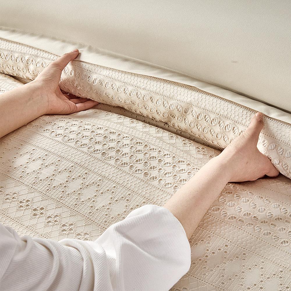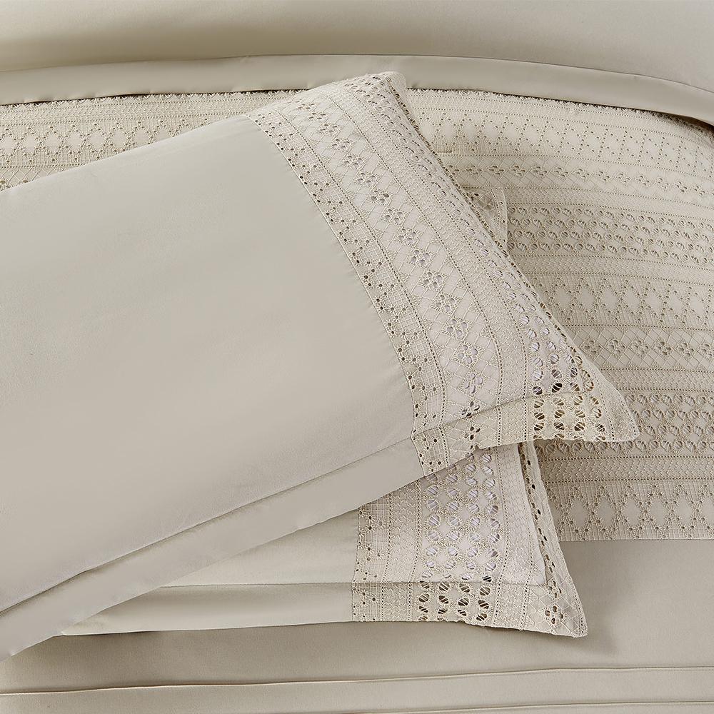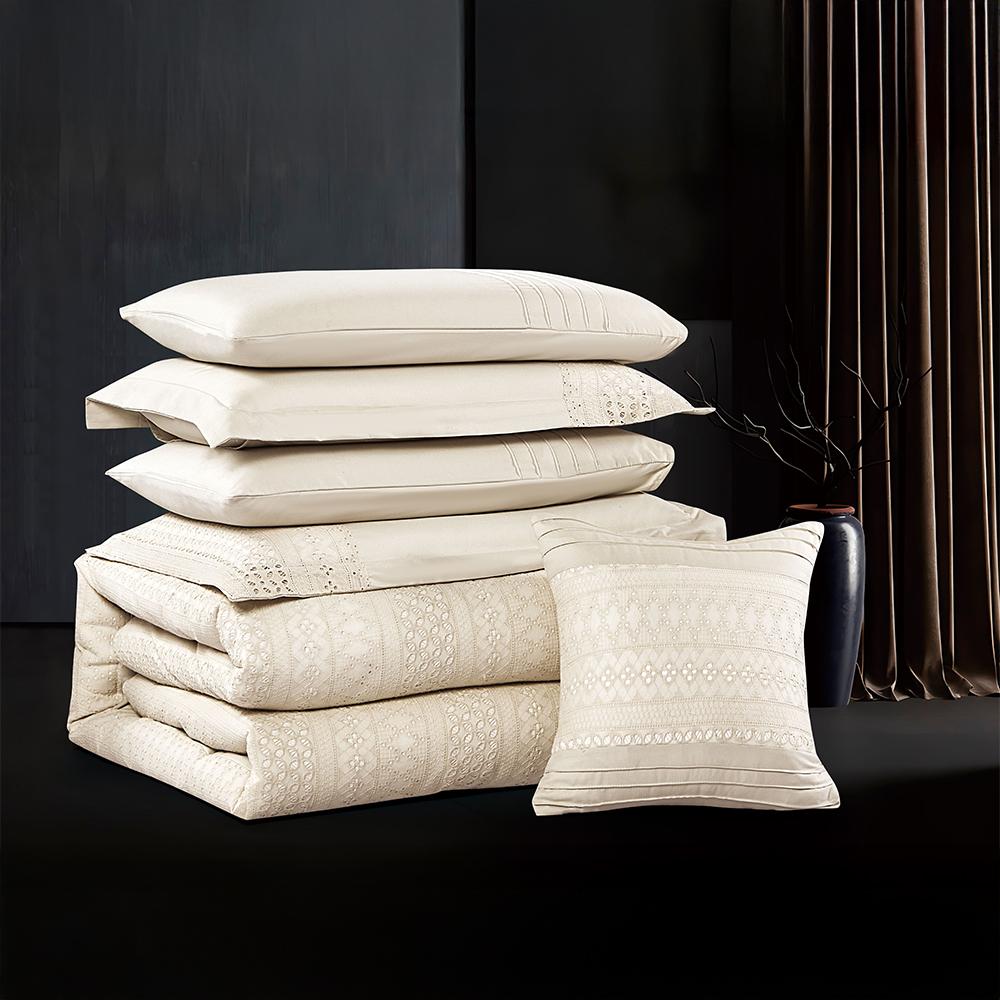 مفرش صيفي مزدوج مطرز مزين بالدانتيل 7 قطع - غوينيفير - بيج فاتح